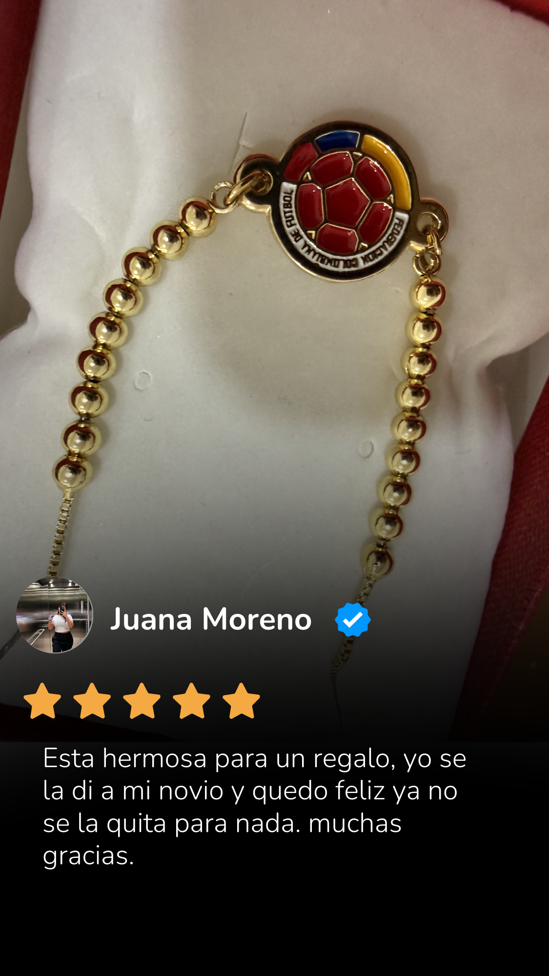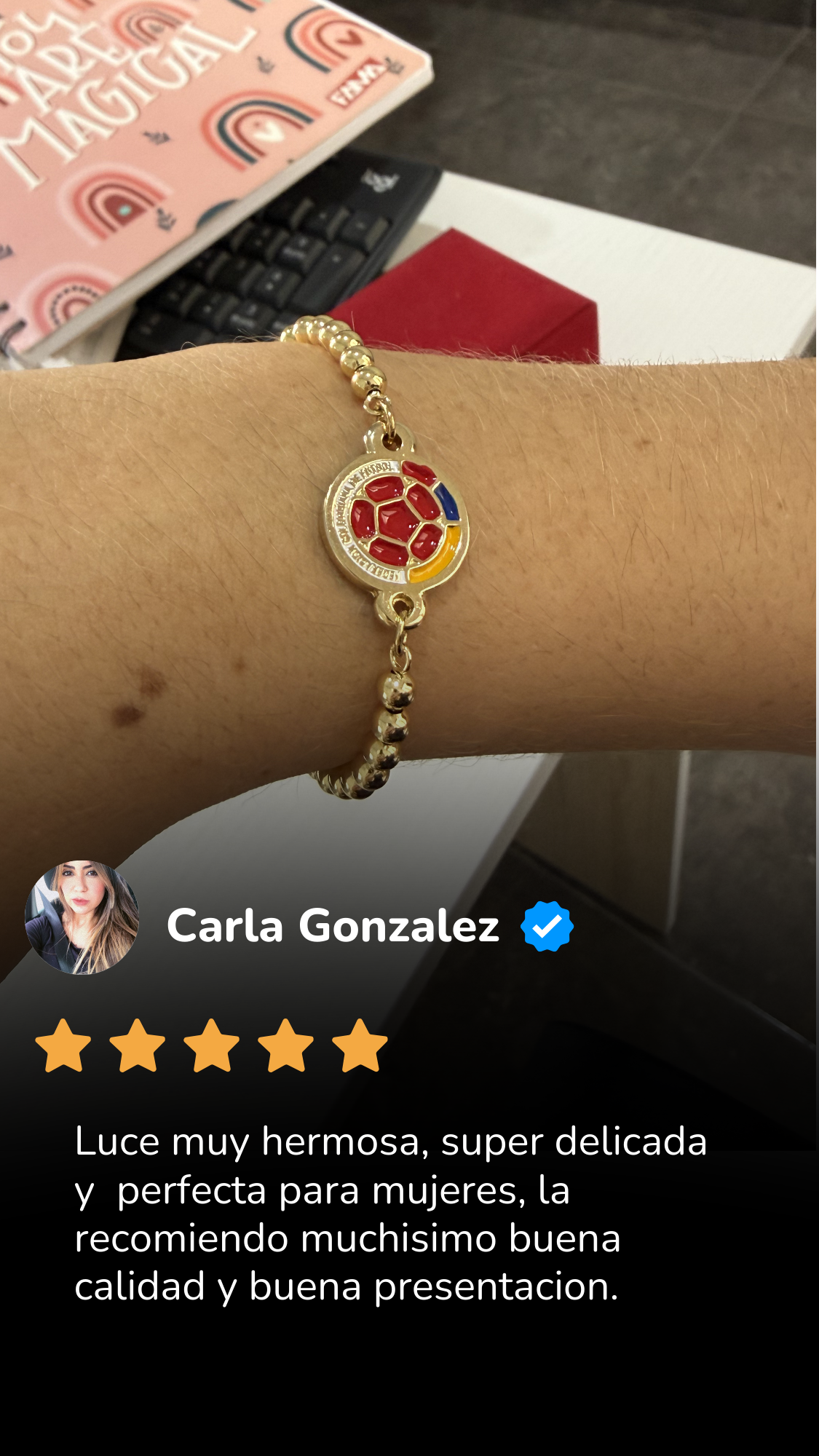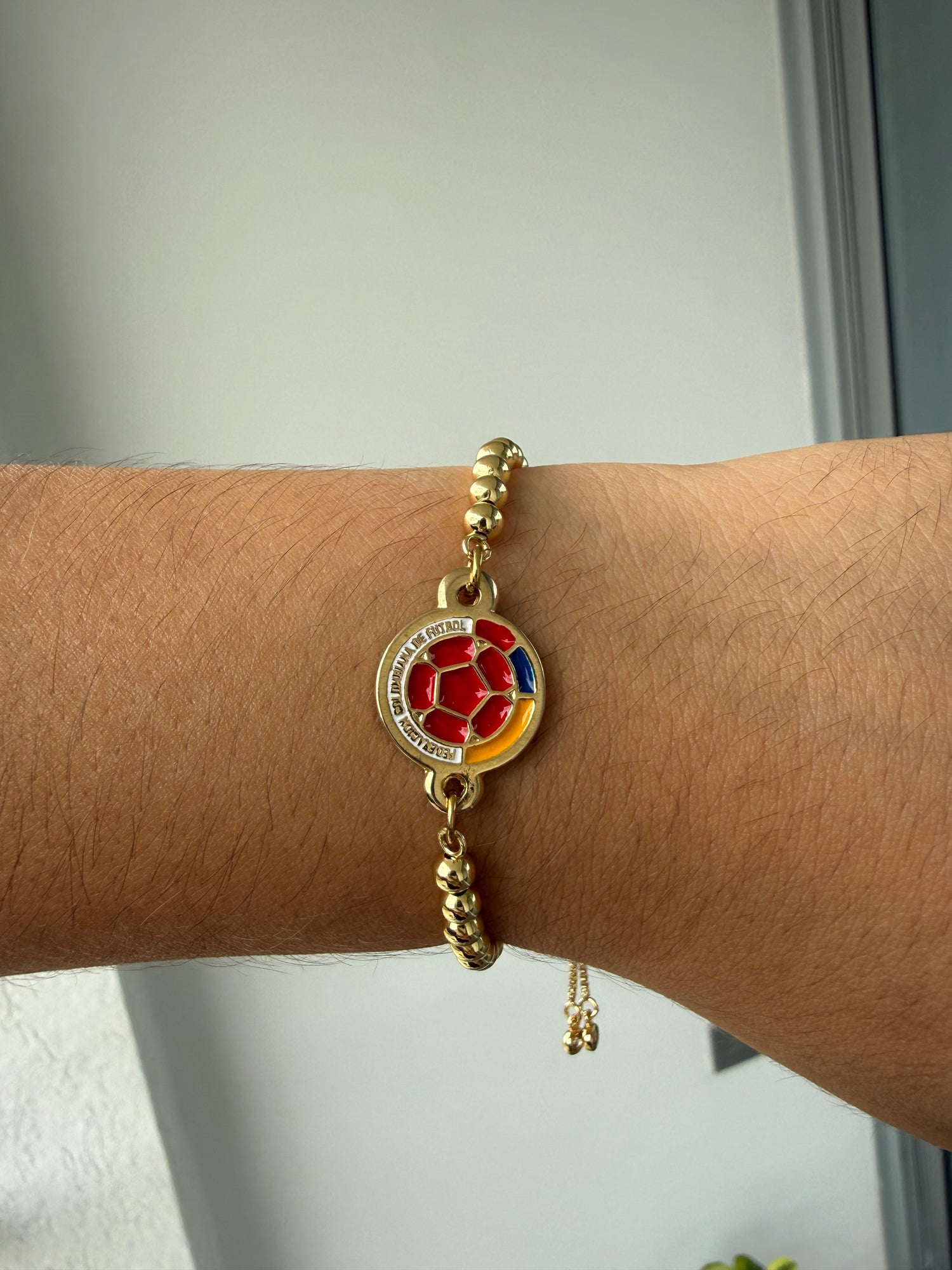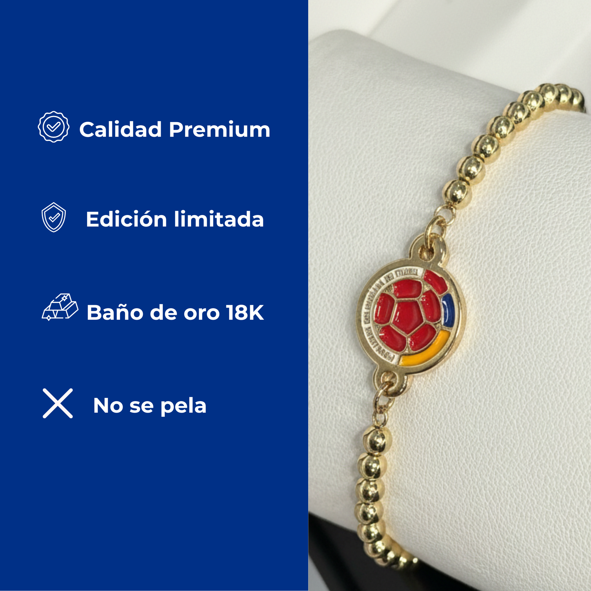 La pulsera está fabricada con materiales resistentes y acabado dorado de alta calidad, ORO DE 18K, diseñados para mantener su brillo con el uso normal. Para prolongar su duración, se recomienda evitar el contacto con perfumes o químicos fuertes.